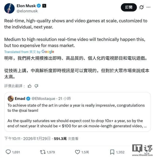 不过,马斯克现在还在对这一观点持续加码。他昨天在 X 平台表示:“我们明年将大规模推出可实时生成、具备高质量、并能按个人定制的影视内容和电子游戏”。
