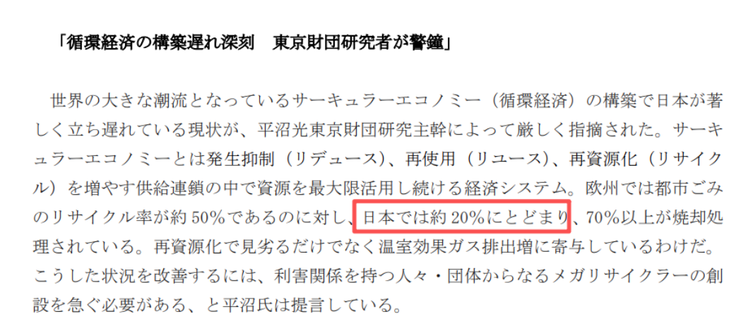 东京财团研究主干平沼光严肃指出,在循环经济(Circular Economy)构建的全球大趋势方面,日本已显著落后。