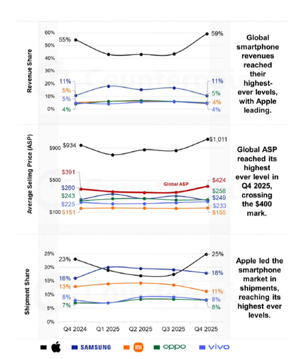 调研机构Counterpoint Research的数据显示,全球智能手机在2025年第四季度的平均售价首次突破400美元,同比上涨 8%,延续了此前高端化带动ASP持续走高的趋势。