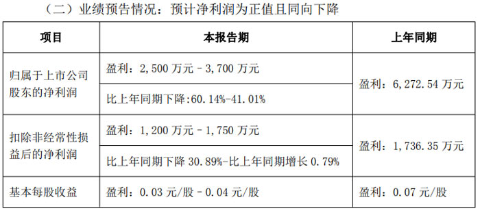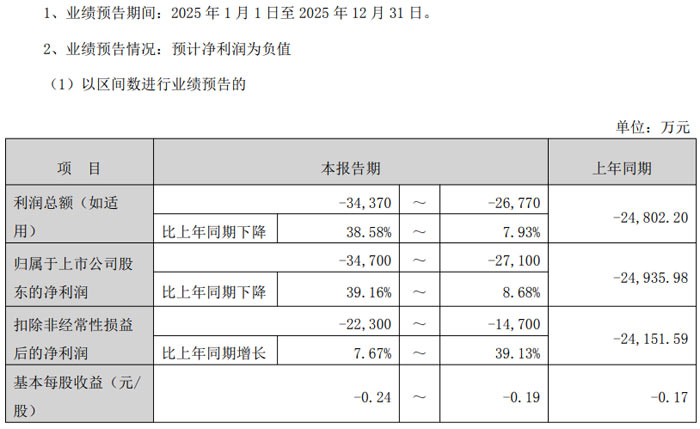 利润总额预计为 - 28,000 万元至 - 22,000 万元,上年同期为 - 38,560 万元;归属于上市公司股东的净利润预计为 - 29,200 万元至 - 23,200 万元,上年同期为 - 36,993 万元;扣除非经常性损益后的净利润:预计为 - 31,400 万元至 - 25,400 万元,上年同期为 - 39,317 万元;