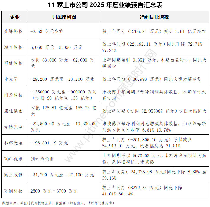 2026年1月30日,光峰科技、鸿合科技、冠捷科技、中光学、闻泰科技、康佳集团、龙腾光电、和辉光电、GQY 视讯、勤上股份、万润科技11家上市公司相继发布2025年度业绩预告或业绩快报。集中呈现了行业调整期内企业的经营态势,也透露出部分企业的突围迹象。
