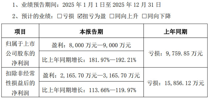业绩预告显示,2025 年 1 月 1 日至 12 月 31 日期间,公司归属于上市公司股东的净利润预计为 8000 万元 - 9000 万元,相较于上年同期的亏损 9759.85 万元,同比增长 181.97%-192.21%;扣除非经常性损益后的净利润预计为 2165.70 万元 - 3165.70 万元,上年同期为亏损 15856.12 万元,同比增长 113.66%-119.97%。