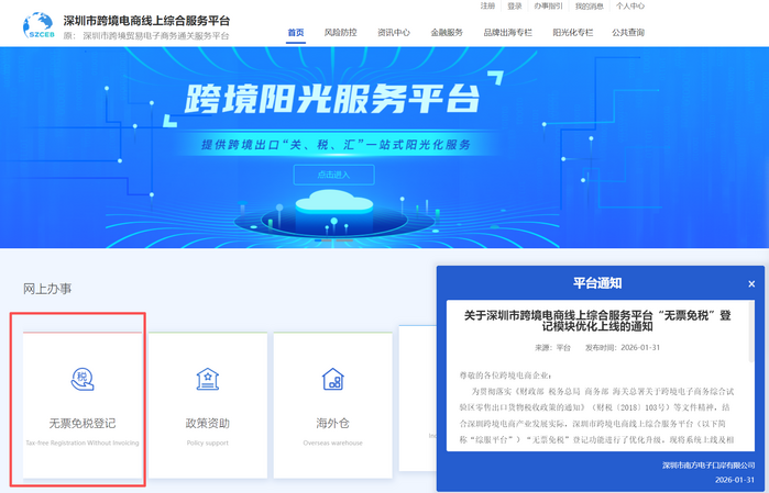 【亿邦原创】日前,深圳市商务局发布通知,已对深圳市跨境电商线上综合服务平台“无票免税”登记功能进行了优化升级,并于2026年2月1日正式上线运行。