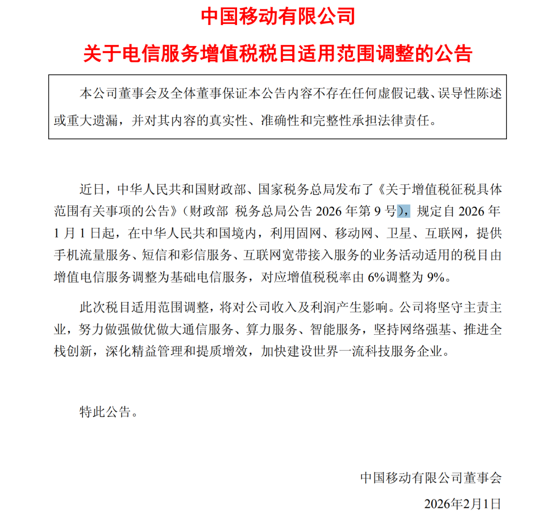 中国移动公告称,近日,中华人民共和国财政部、国家税务总局发布了《关于增值税征税具体范围有关事项的公告》(财政部 税务总局公告2026年第9号),规定自2026年1月1日起,在中华人民共和国境内,利用固网、移动网、卫星、互联网,提供手机流量服务、短信和彩信服务、互联网宽带接入服务的业务活动适用的税目由增值电信服务调整为基础电信服务,对应增值税税率由6%调整为9%。此次税目适用范围调整,将对公司收入及利润产生影响。