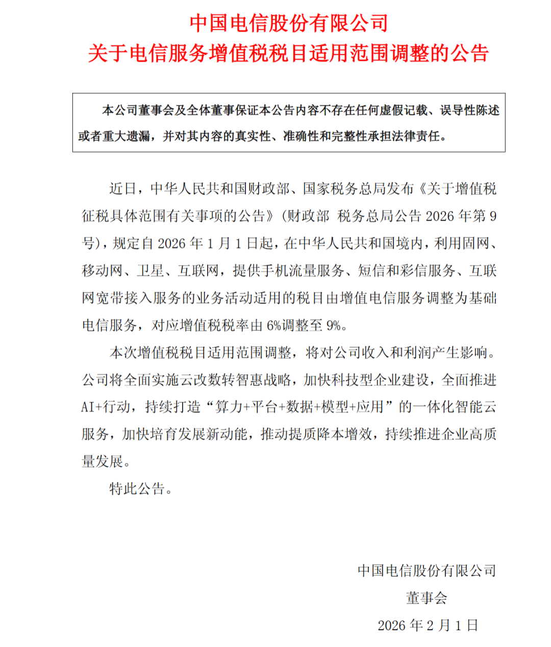 中国电信公告称,近日,中华人民共和国财政部、国家税务总局发布《关于增值税征税具体范围有关事项的公告》(财政部 税务总局公告2026年第9号),规定自2026年1月1日起,在中华人民共和国境内,利用固网、移动网、卫星、互联网,提供手机流量服务、短信和彩信服务、互联网宽带接入服务的业务活动适用的税目由增值电信服务调整为基础电信服务,对应增值税税率由6%调整至9%。本次增值税税目适用范围调整,将对公司收入和利润产生影响。