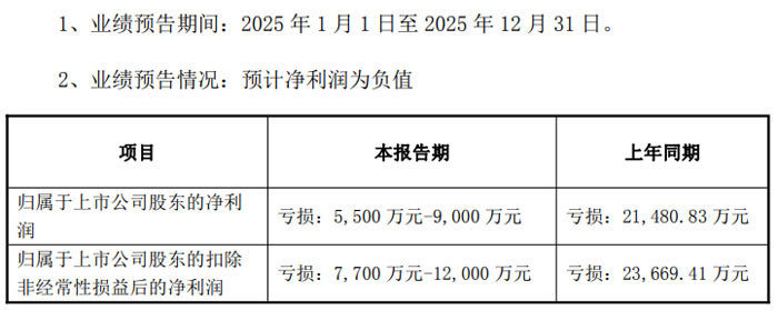 业绩预告期间为 2025 年 1 月 1 日至 2025 年 12 月 31 日。数据显示,公司归属于上市公司股东的净利润预计亏损 5500 万元 - 9000 万元,上年同期该指标亏损 21480.83 万元;归属于上市公司股东的扣除非经常性损益后的净利润预计亏损 7700 万元 - 12000 万元,上年同期亏损 23669.41 万元。