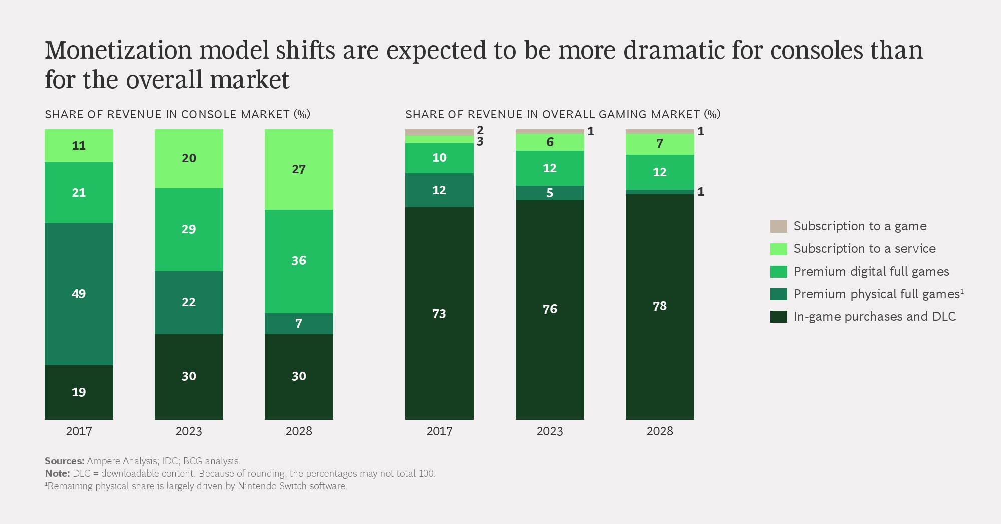 变现模式正在发生结构性转移。移动游戏中,应用内广告收入占比持续提升;主机游戏则表现出订阅制和数字版销售占比快速上升的趋势。数据显示,2017年至2024年,主机实体游戏收入占比持续下滑,而订阅与数字销售合计已接近主机市场收入的一半。用户对广告的接受度也在变化,超过一半的核心玩家表示可以接受在高品质游戏中出现广告。