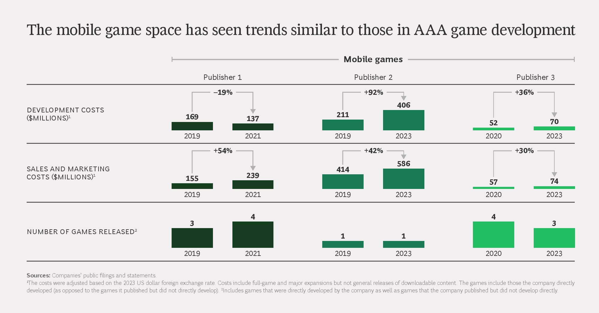 在移动游戏领域,类似趋势同样存在。2019年至2023年,多家移动游戏发行商的开发与营销成本累计增长在40%至90%之间,但产品数量基本持平甚至下降,行业集中度持续提高。收入增长更多依赖头部产品生命周期延长,而非新品驱动。