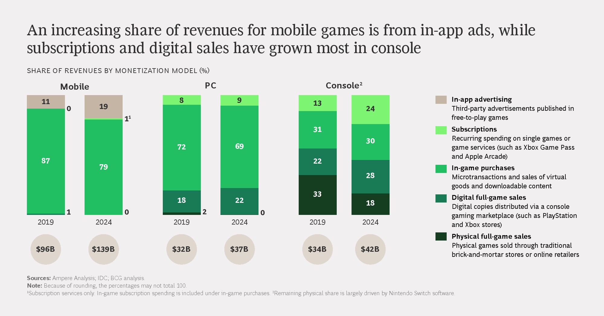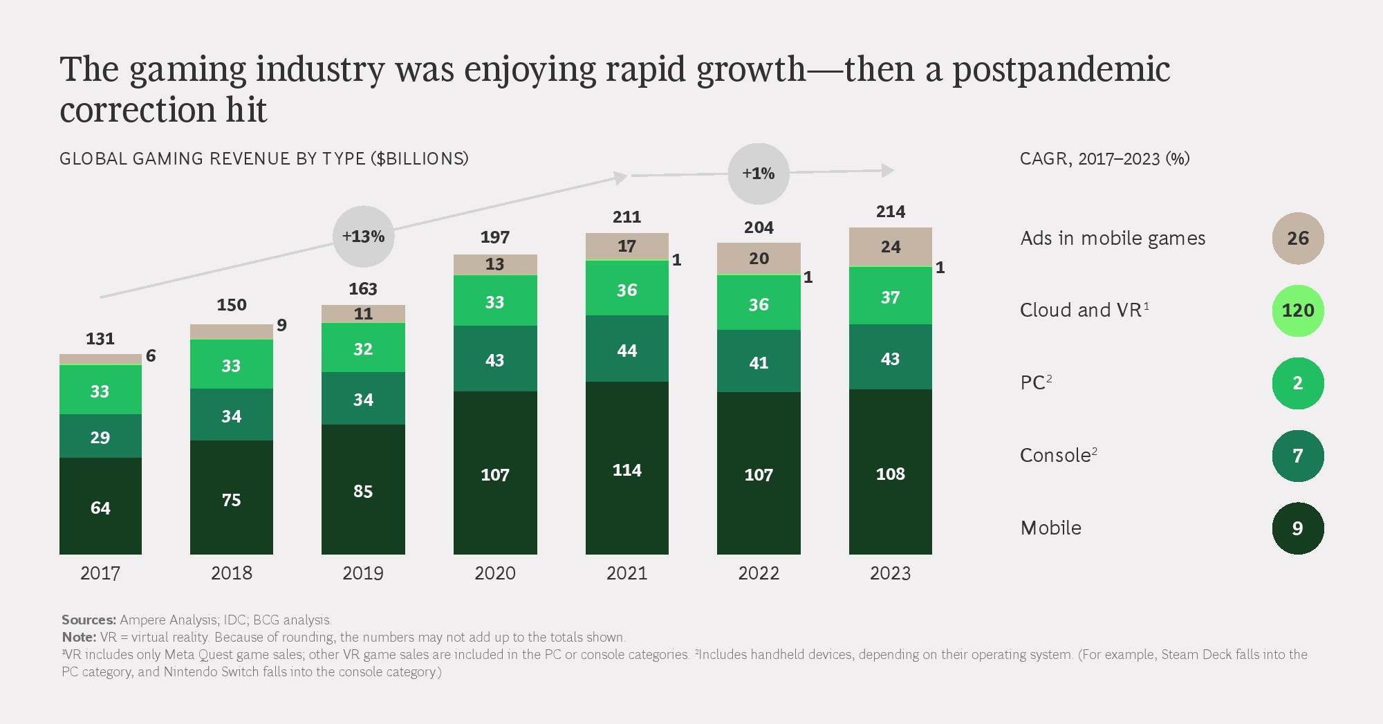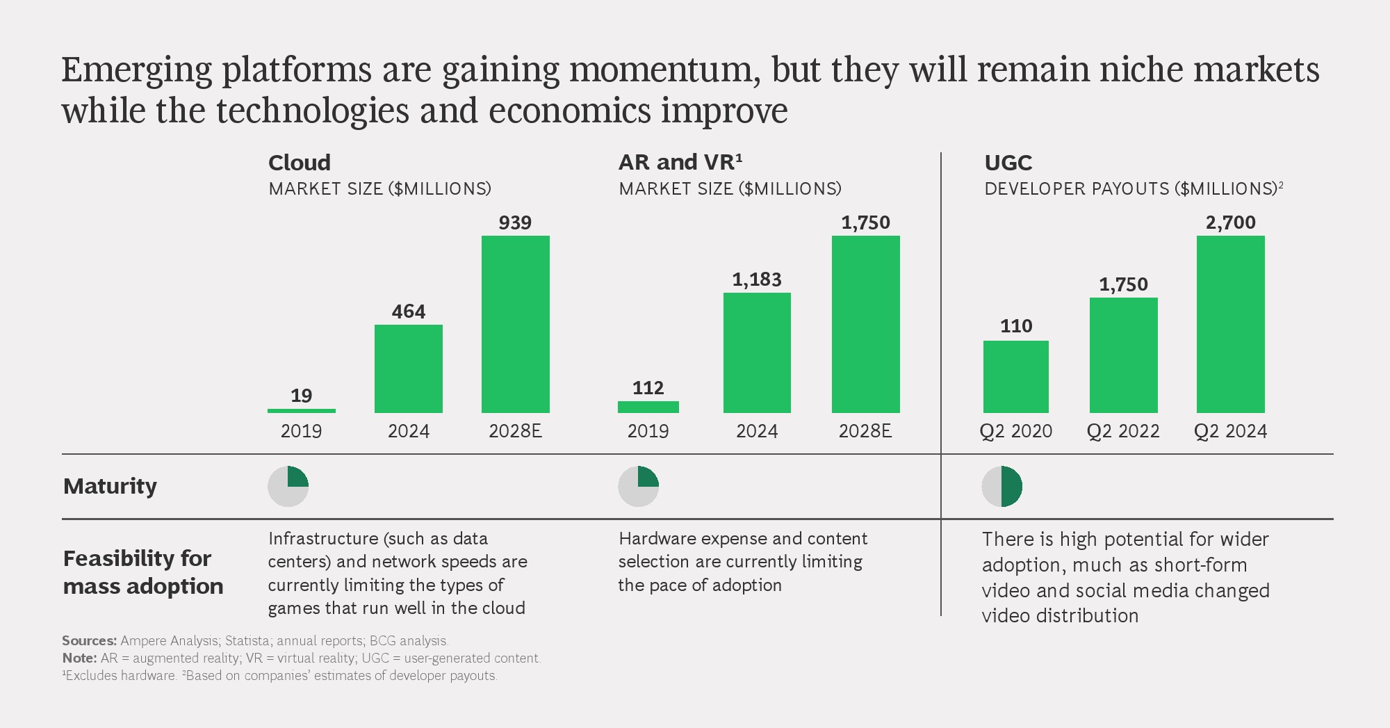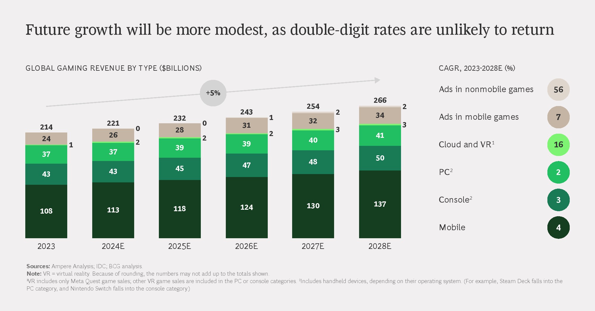 从结构看,移动游戏仍是最大收入来源,2023年规模接近1100亿美元,但增长动能明显减弱。相比之下,主机和PC游戏收入保持相对稳定,云游戏与VR等新形态虽保持高增长,但到2028年合计市场规模仍不足全球市场的5%,短期内难以成为核心支柱。基础设施成本、网络延迟和硬件门槛,仍是制约其规模化的关键因素。