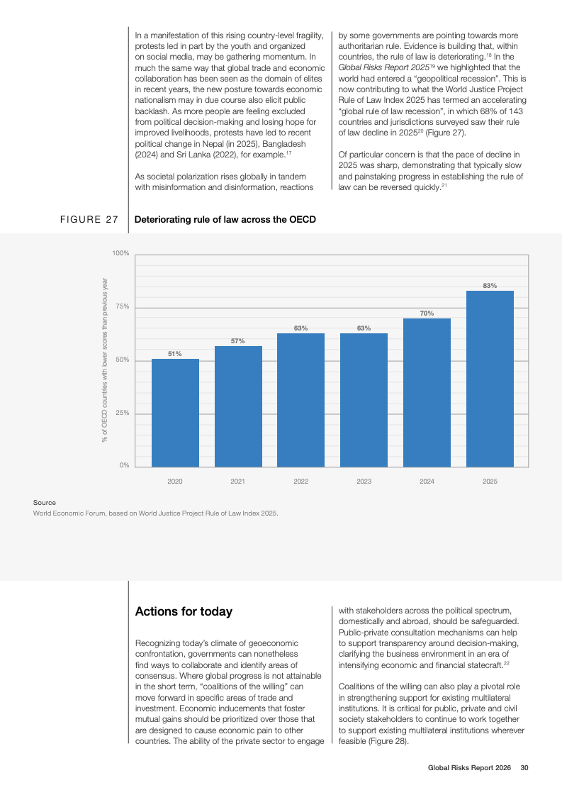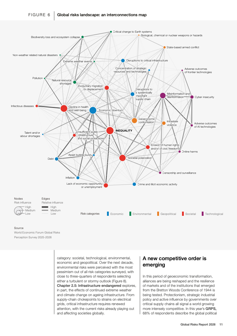 社会层面的脆弱性进一步放大。不平等连续第二年被认定为全球最具关联性的风险,与经济衰退、社会极化和错误信息形成相互强化的风险网络。调查显示,财富集中与生活成本压力并存,使社会契约承压,民主制度和公共治理的信任基础被持续侵蚀,进而削弱各国应对危机的政策执行力。