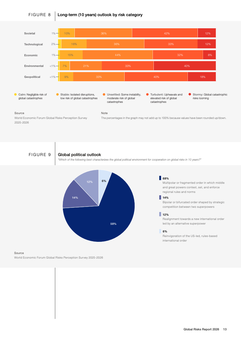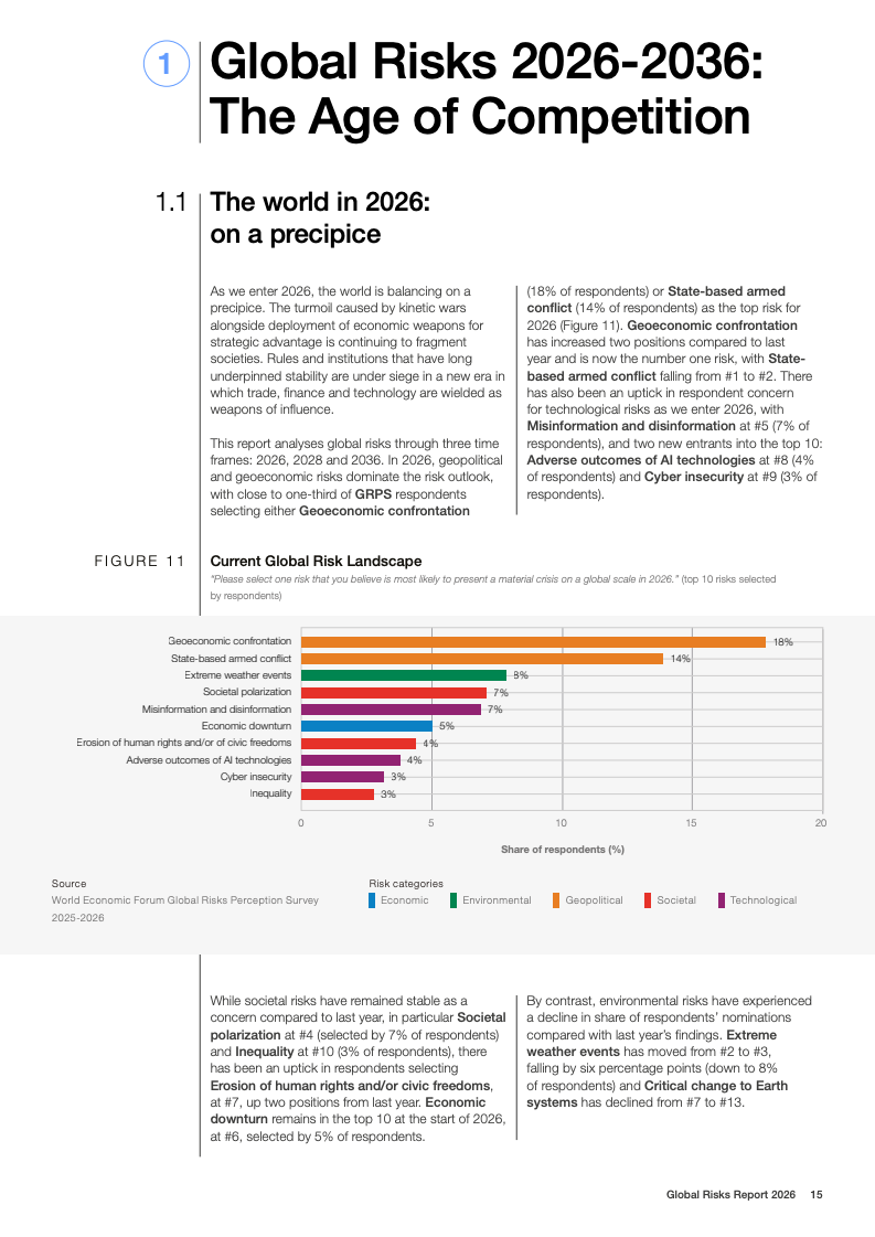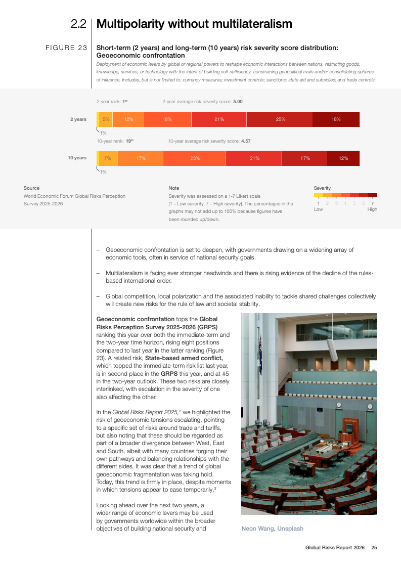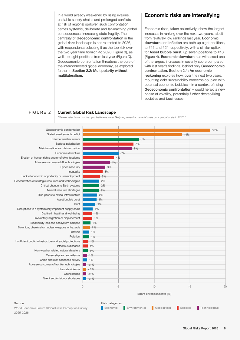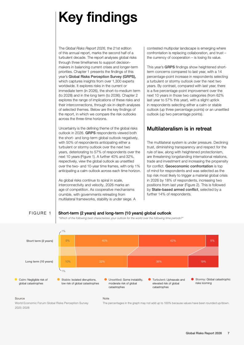 全球风险报告2026基于2025至2026年对1300余名全球专家的调查结果显示,不确定性成为2026年的核心特征。50%的受访者认为未来两年全球形势将呈现动荡或风暴状态,较上一年上升14个百分点;放眼十年,这一比例进一步升至57%。地缘经济对抗首次跃升为短期最具破坏性的全球性风险,18%的受访者将其视为2026年最可能引发系统性危机的因素,反映出多边合作机制持续弱化。