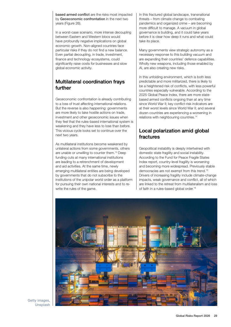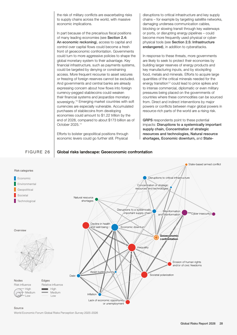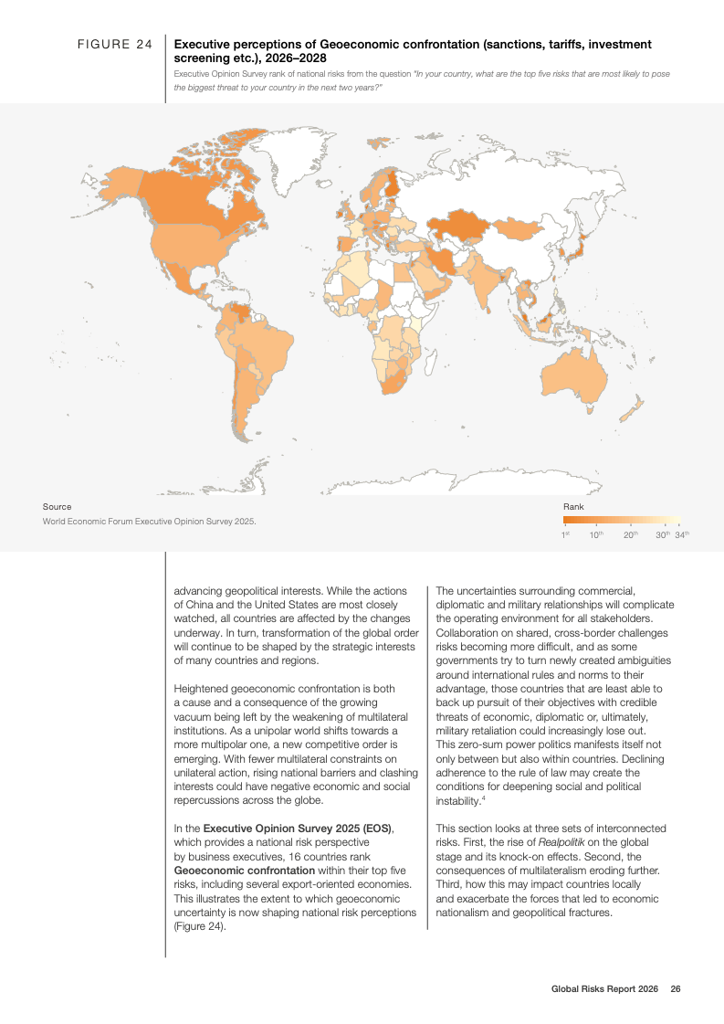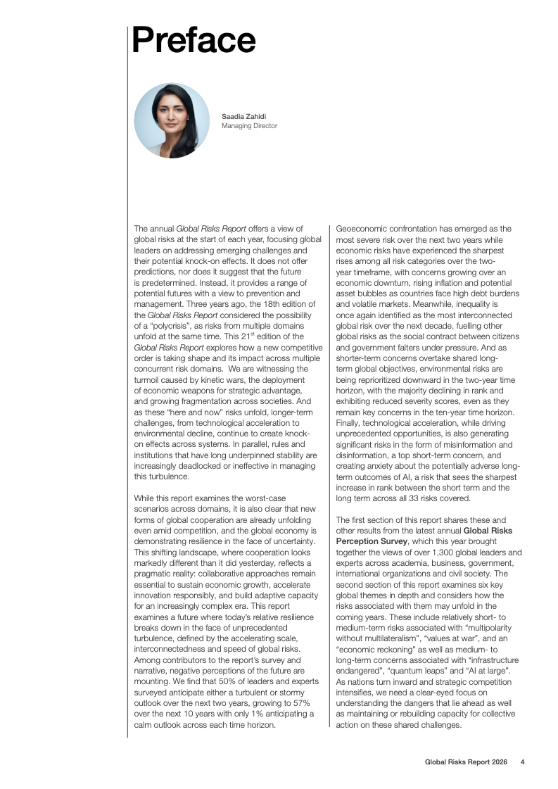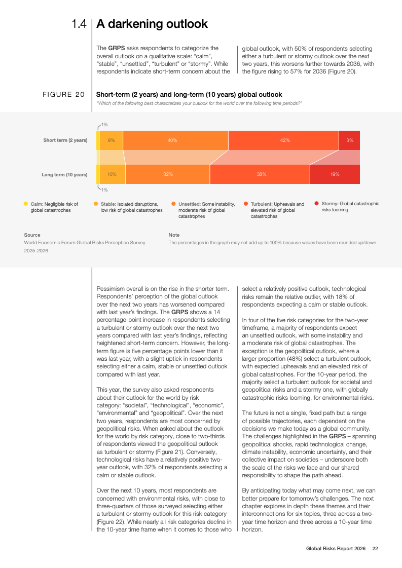 全球风险报告2026基于2025至2026年对1300余名全球专家的调查结果显示,不确定性成为2026年的核心特征。50%的受访者认为未来两年全球形势将呈现动荡或风暴状态,较上一年上升14个百分点;放眼十年,这一比例进一步升至57%。地缘经济对抗首次跃升为短期最具破坏性的全球性风险,18%的受访者将其视为2026年最可能引发系统性危机的因素,反映出多边合作机制持续弱化。