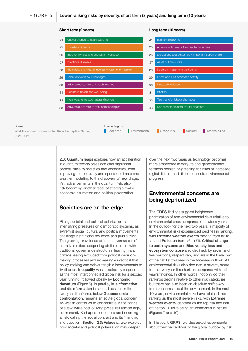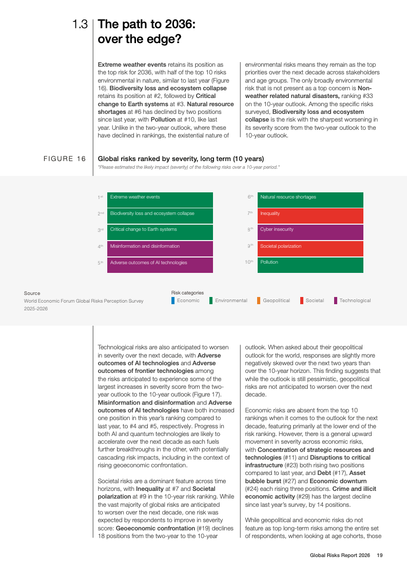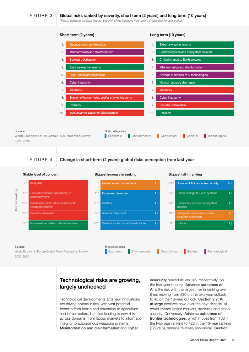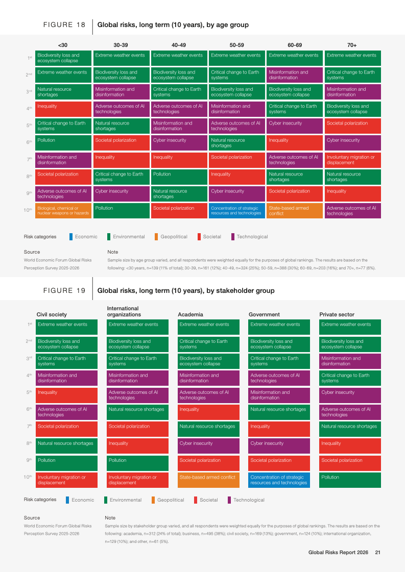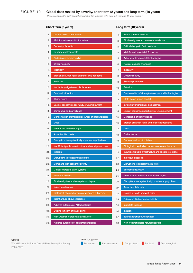 技术风险呈现明显的时间错位特征。短期内,虚假信息与网络安全风险位列前列;长期看,人工智能不利后果的风险排名从两年期的末位跃升至十年期前五,是所有风险中跨期上升幅度最大的领域。与此同时,环境风险在短期内被相对低估,但在十年期展望中仍占据前十风险中的半数,极端天气被一致认为是最严重的长期威胁。