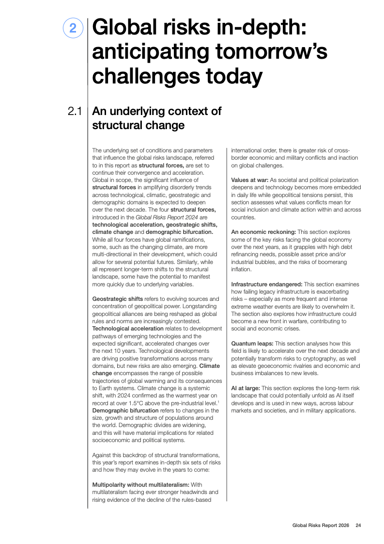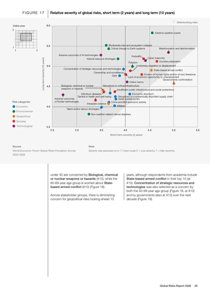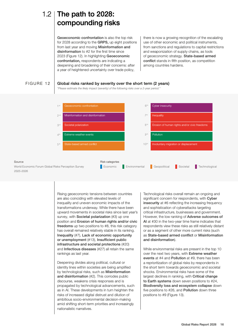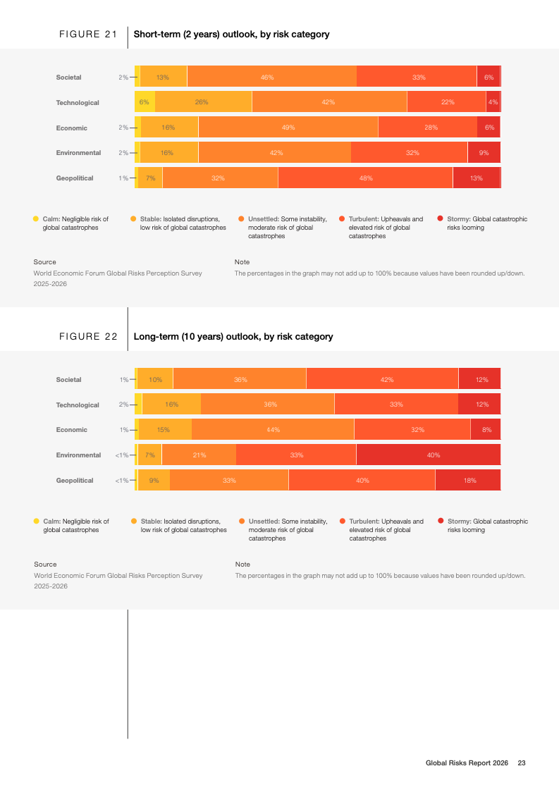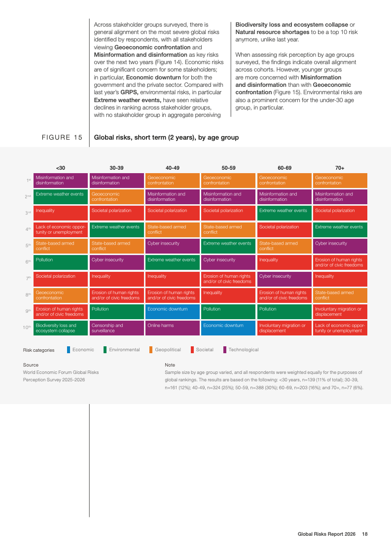 技术风险呈现明显的时间错位特征。短期内,虚假信息与网络安全风险位列前列;长期看,人工智能不利后果的风险排名从两年期的末位跃升至十年期前五,是所有风险中跨期上升幅度最大的领域。与此同时,环境风险在短期内被相对低估,但在十年期展望中仍占据前十风险中的半数,极端天气被一致认为是最严重的长期威胁。
