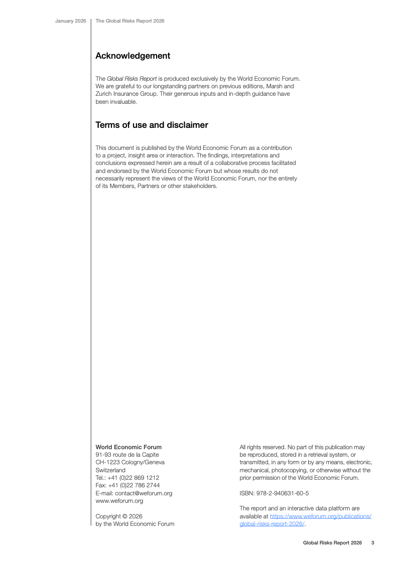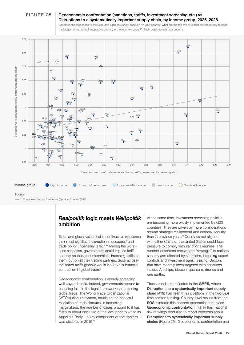 从风险结构看,经济类风险在短期内显著抬头。经济衰退与通胀在两年期风险排名中均上升8位,资产泡沫破裂上升7位。高债务水平与金融市场波动相互叠加,使经济风险的严重度评分出现除地缘经济对抗之外的最大增幅,显示宏观金融稳定正在成为政策与市场的共同压力点。