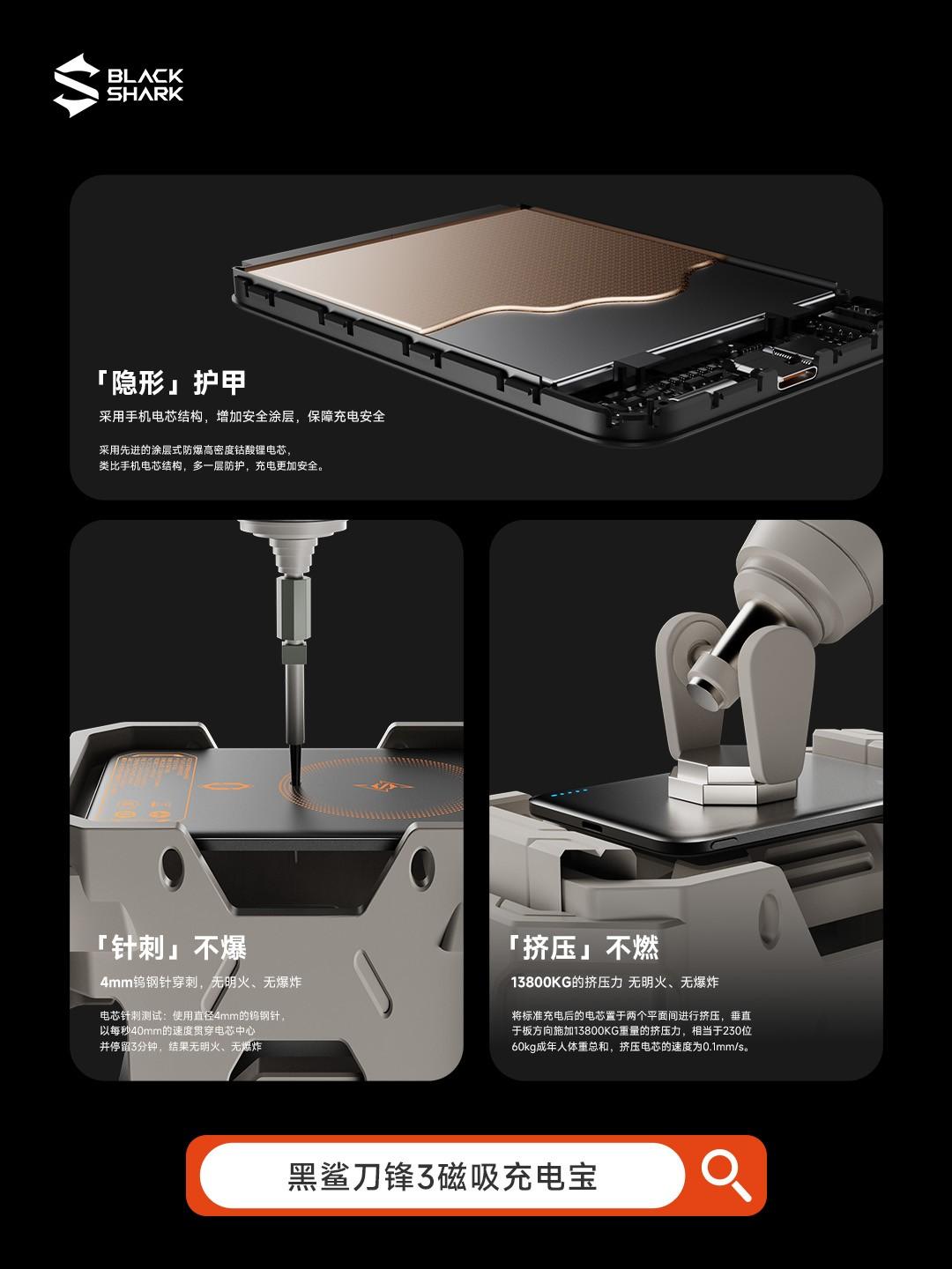 黑鲨刀锋3在外观设计上亦独具匠心,机身采用双面风格设计:一面采用苹果式简约高级风格,质感出众;另一面延续黑鲨标志性的炫酷机甲风,彰显电竞基因。机身轮廓运用G3连续曲线,大幅提升握持舒适度。机身上的黑鲨LOGO采用烧青工艺打造,色泽持久、耐磨耐刮,长久使用仍焕然如新,而磁吸面则采用的是触感温润的UV准分子工艺,不易剐蹭手机后盖。此外,充电宝内置17颗N52高性能磁铁,磁吸力高达12.8N,吸附稳固可靠,即使佩戴手机壳也能牢固贴合,带来便捷无忧的磁吸体验。
