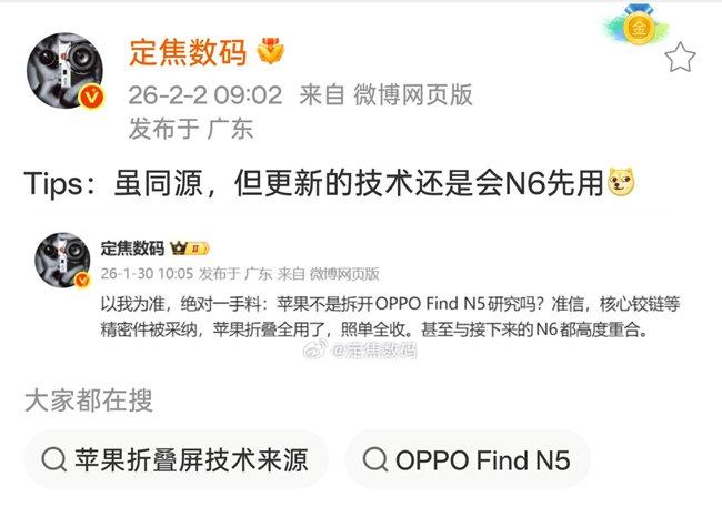 数码博主@定焦数码近日透露,苹果在折叠屏研发过程中,曾拆解OPPO Find N5,部分精密结构被直接采纳,苹果折叠屏方案“照单全收”,甚至与后续 OPPO Find N6 的设计高度重合。也就是说,在折叠屏这一前沿形态上,苹果正在向 OPPO 学习。