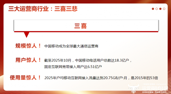二喜,用户惊人!截至2025年10月,中国移动电话用户总数达18.3亿户,固定互联网宽带接入用户达6.51亿户。