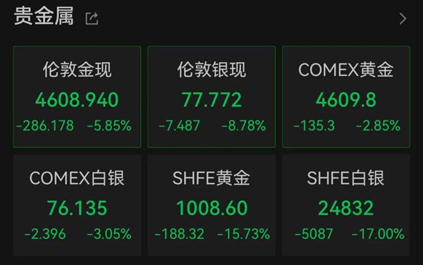 2月2日,国际贵金属价格持续下挫,现货黄金、白银价格再度跳水,现货白银盘初一度跌超14%,现货黄金一度跌超9%。