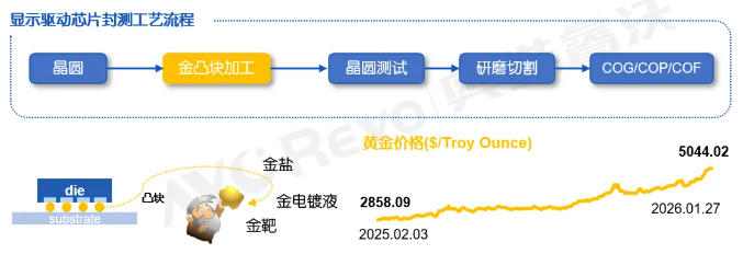 就显示驱动芯片而言,其主流的封测工艺流程涵盖了Gold Bumping(金凸块制造)、CP(晶圆测试)、背面研磨与切割,以及后续的COG/COP/COF封装环节。在Gold Bumping环节需大量消耗金盐、金靶材及金电镀液等核心原材料。由于金盐等材料采购的平均价格变动趋势与黄金的价格波动基本保持一致,金价的波动直接影响金凸块制造成本。