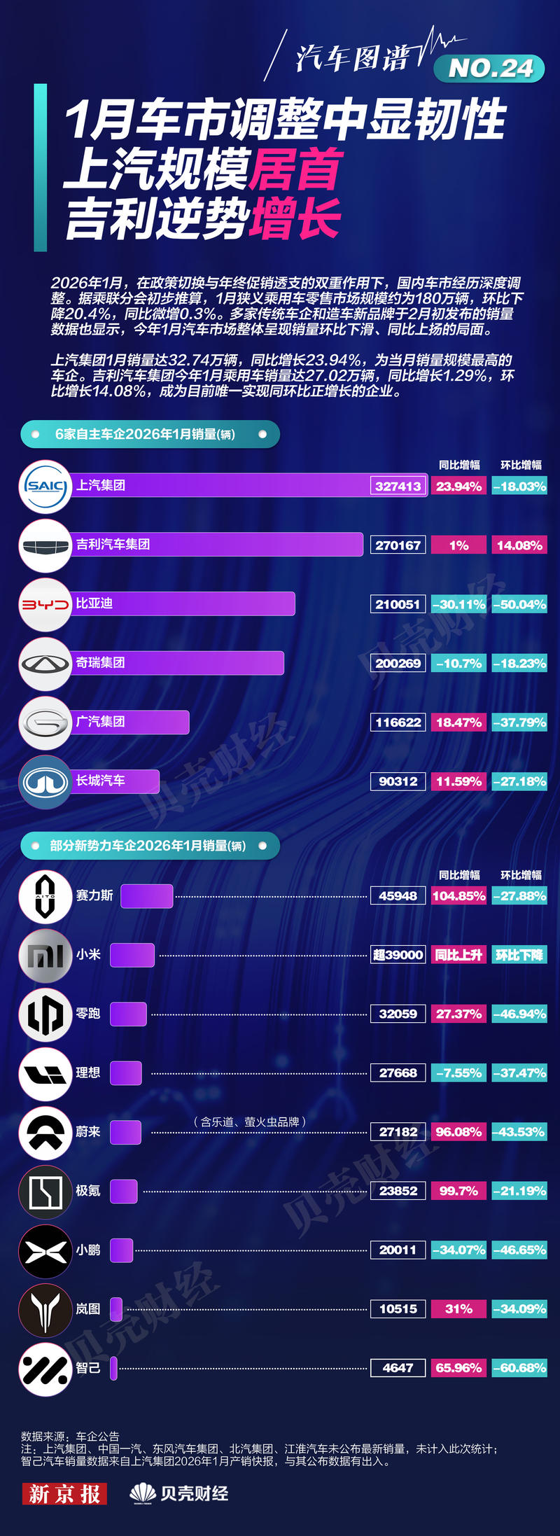 上汽集团1月销量达32.74万辆,同比增长23.94%,为当月销量规模最高的车企。