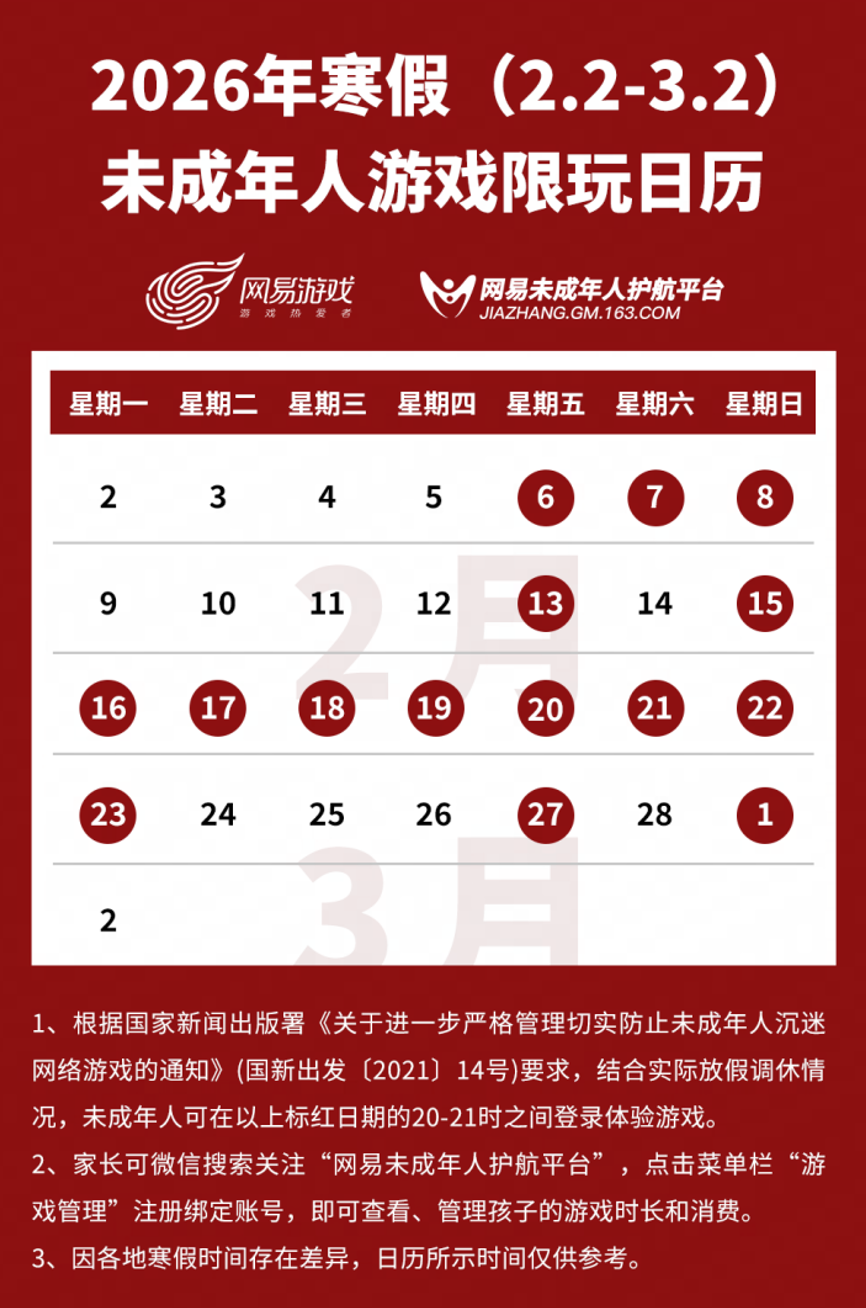 随着2026年寒假及春节假期的临近,未成年人网络生活将迎来高峰期。2月3日消息,网易游戏正式发布《2026年寒假未成年人游戏限玩日历》。根据日历标注,未成年人寒假期间仅可在每周五、周六、周日以及春节法定假期晚间20时至21时登录体验游戏,其余日期均无法游玩,整个寒假期间可体验游戏时间不超过15小时。