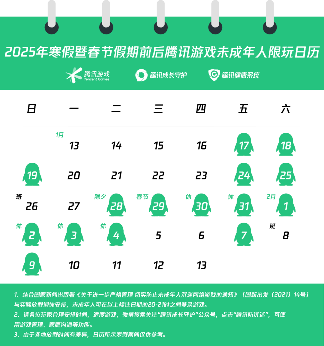 此前,腾讯游戏也发布了2026寒假限玩日历表,显示未成年人寒假可在1月17日、18日、19日、24日、25日、28日-2月4日以及2月7日和9日的晚上20-21时登录游戏共计15小时,其中春节假期可玩8小时。