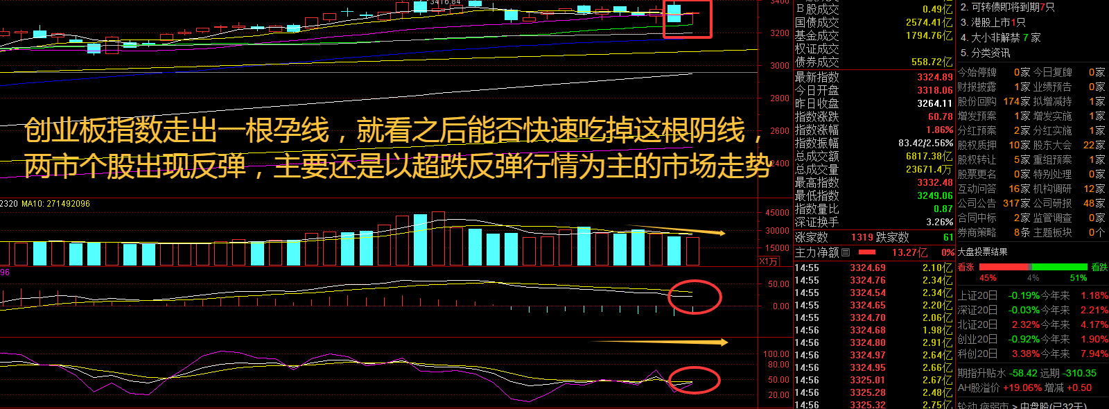 创业板指数周二出现中小创个股两极分化的走势,大宗商品板块个股集体大跌,这也是近期“涨多必跌”的规律。多家国际资管巨头在近日发布的2026年投资展望中认为,中国股票估值仍具吸引力,市场有望延续上涨趋势,其中,科技、医药、新能源等领域值得重点关注。接下来注意创业板指数能否在3310点之上稳住。