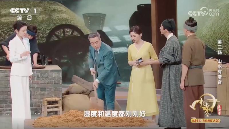 《2025中国诗词大会》第三期活动现场,主持人和文学嘉宾一起体验古井贡酒制曲环节。
