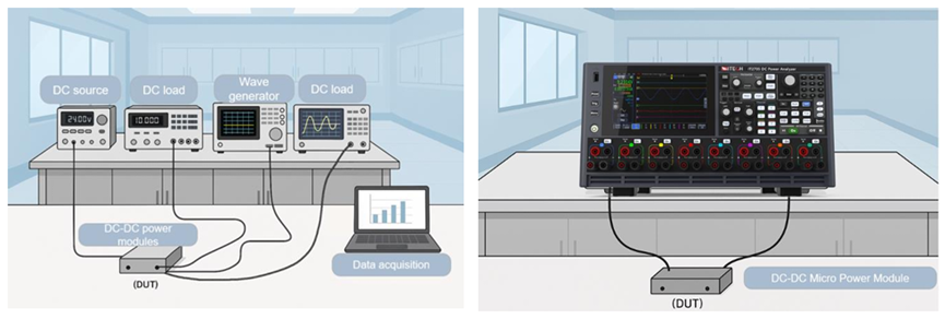 传统测试方案通常需要数字万用表、直流电源、电子负载、示波器、任意波形发生器等多款仪器协同工作,不仅存在接线复杂的问题,还会导致多设备间的数据采集不同步,难以精准捕捉瞬态细节,整体测试流程繁琐、效率低下。