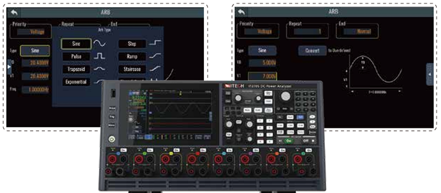 IT271XX / IT273XX / IT275XX / IT278XX模块化直流功率分析仪模块均配备高性能任意波形(ARB)输出能力,允许用户定义电压、电流、功率或电阻值,随时间变化,实现精确的输出序列。这使得能够精确模拟被测器件输入端的电压瞬变、掉落事件、负载脉冲及其他动态行为。 内置多种标准波形类型,包括正弦波、脉冲波、梯形波、指数波、阶梯波、斜坡波、阶梯波形以及用户自定义波形(支持最多128点数据导入)。ARB功能广泛应用于电池工作状态模拟、直流-直流稳定性测试以及通信设备激活行为分析等领域。