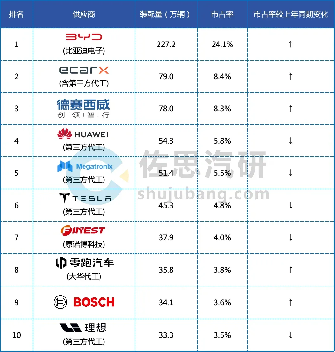 图片来自盖世汽车与之对比的是,在2024年1—7月,排名第一的博世装机量1537785套,市场份额22.5%,而华为排名第十,装机量241636套,市场份额3.5%。