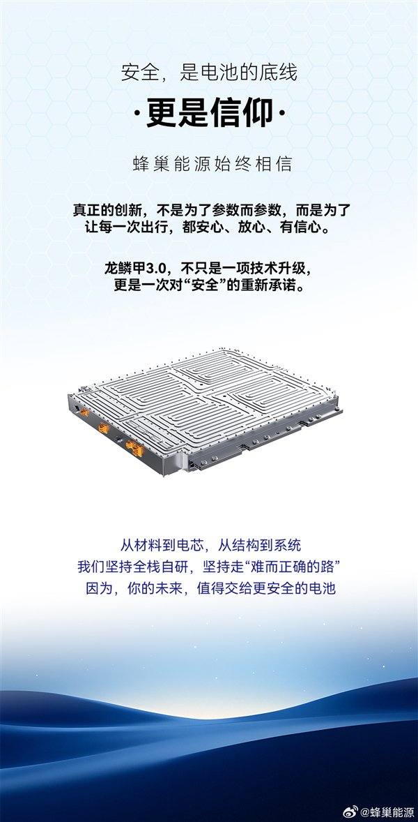 快科技2月3日消息,蜂巢能源今日正式发布龙鳞甲3.0电池包系统,首次将电池安全带入“主动防御”时代。