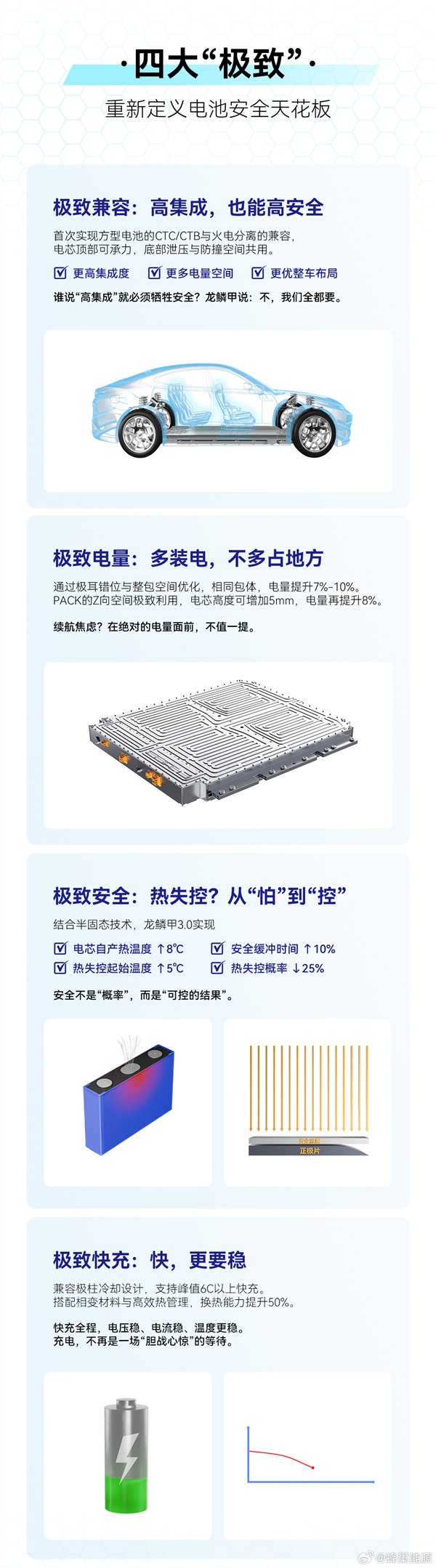 结合半固态技术,龙鳞甲3.0还实现了电芯自产热温度提升8℃,安全缓冲时间提升10%、热失控起始温度提升5℃,热失控概率降低25%。