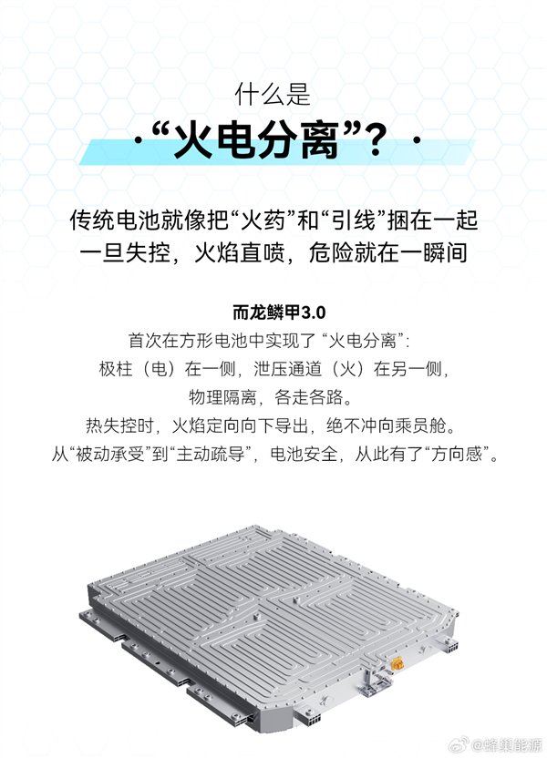据介绍,传统电池就像把“火药”和“引线”捆在一起,一旦失控,火焰直喷。而龙鳞甲3.0首次在方形电池中实现了“火电分离”:极柱(电)在一侧,泄压通道(火)在另一侧,物理隔离,各走各路。热失控时,火焰定向向下导出,绝不冲向乘员舱。