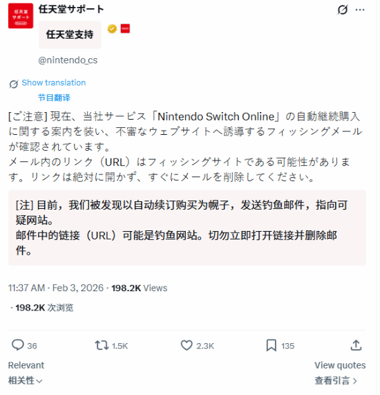 2月3日消息,任天堂发布安全提醒,确认近期出现伪装成NintendoSwitchOnline自动续费通知的钓鱼邮件,此类邮件诱导用户点击可疑链接,存在账号信息泄露及财产安全风险。