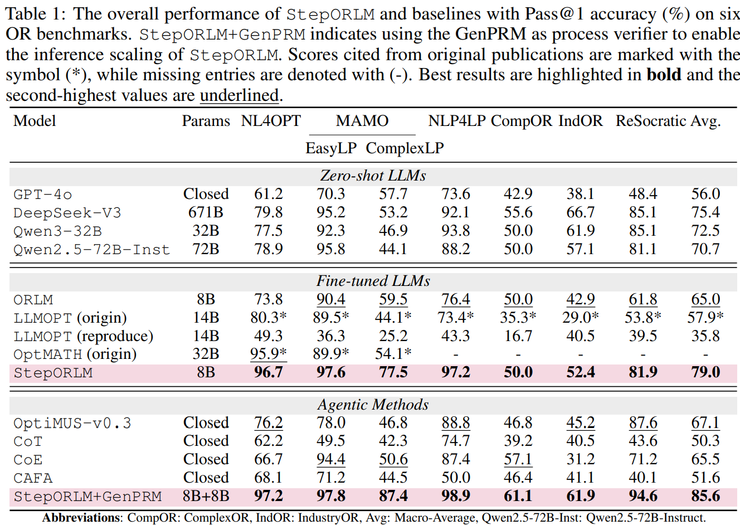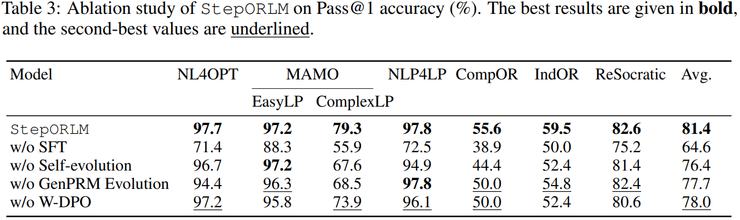 这项研究并未仅从模型规模或数据量入手,而是从训练范式本身出发,系统性反思了结果奖励与传统过程监督在运筹建模任务中的根本局限,并提出了一种由策略模型与生成式过程奖励模型(GenPRM)协同进化的自进化训练框架。通过将最终求解结果与对完整推理过程的回顾式、全局评估相结合,StepORLM 试图引导模型真正学习如何构建一致、可靠的运筹优化模型,而不仅仅是生成一个可行解。