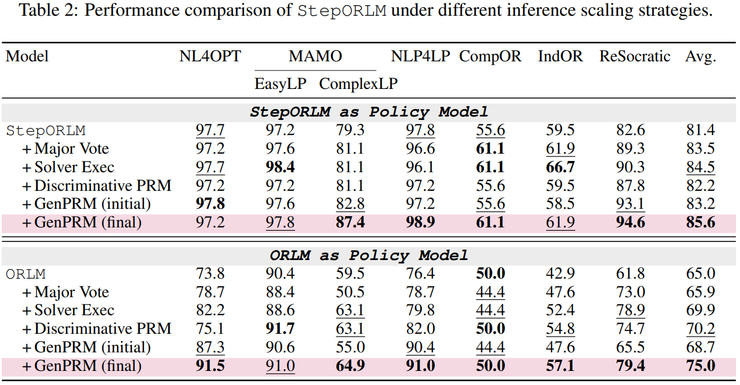 此外,研究还评估了将共同进化得到的生成式过程奖励模型引入推理阶段、作为验证器的效果。实验结果显示,当 StepORLM 与 GenPRM 结合使用时,其平均 Pass@1 准确率可进一步提升至 85.6%,并在最具挑战性的 ComplexOR 和 IndustryOR 数据集上分别取得了约 9.9% 和 9.5% 的显著增益。