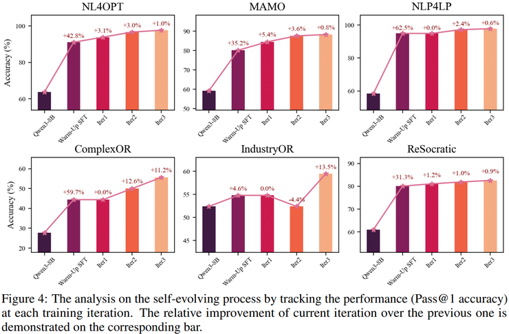 随着训练迭代的推进,策略模型生成的轨迹质量不断提升,反过来为 GenPRM 提供更高质量的训练样本,而不断进化的 GenPRM 又能够为策略模型提供更精确的过程反馈,从而在二者之间形成稳定的正反馈闭环,推动整个系统在自进化过程中持续提升运筹优化建模能力。