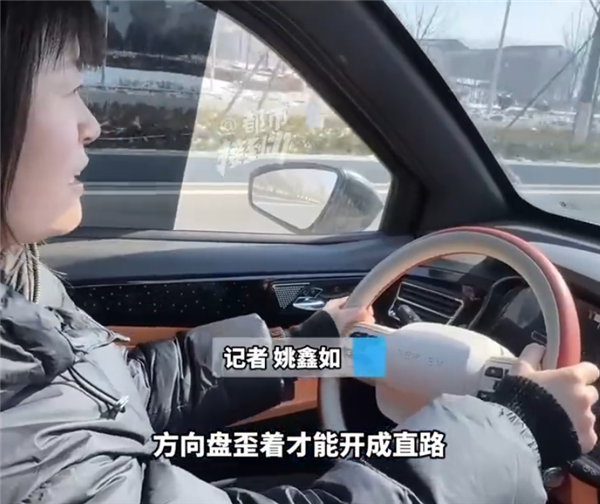 记者实测发现,车辆方向盘还是歪的,只有方向盘歪着的时候,车辆才能走直线。