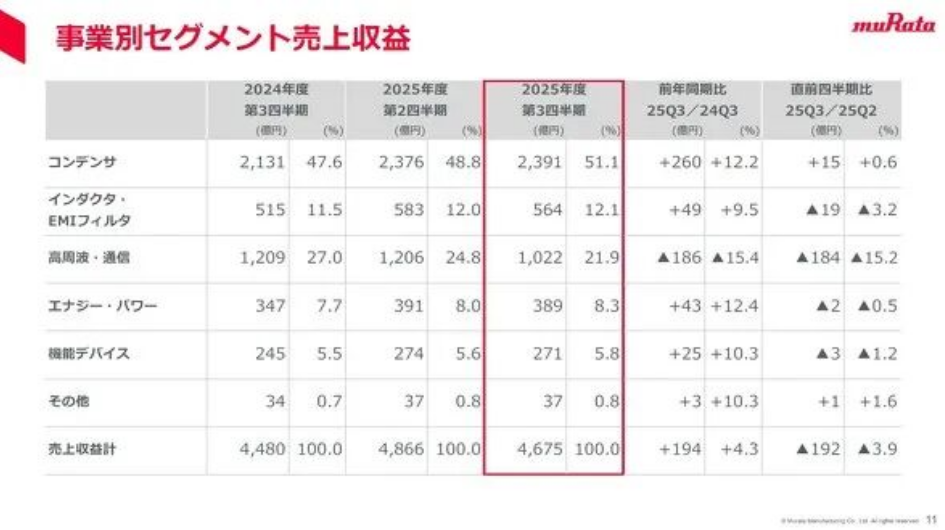 近日,日本(Murata)发布2025财年第三季度(2025年10-12月)财报,公司净销售额同比增长4.3%至4,675亿日元,营业利润则同比大跌50.2%,仅为379亿日元。