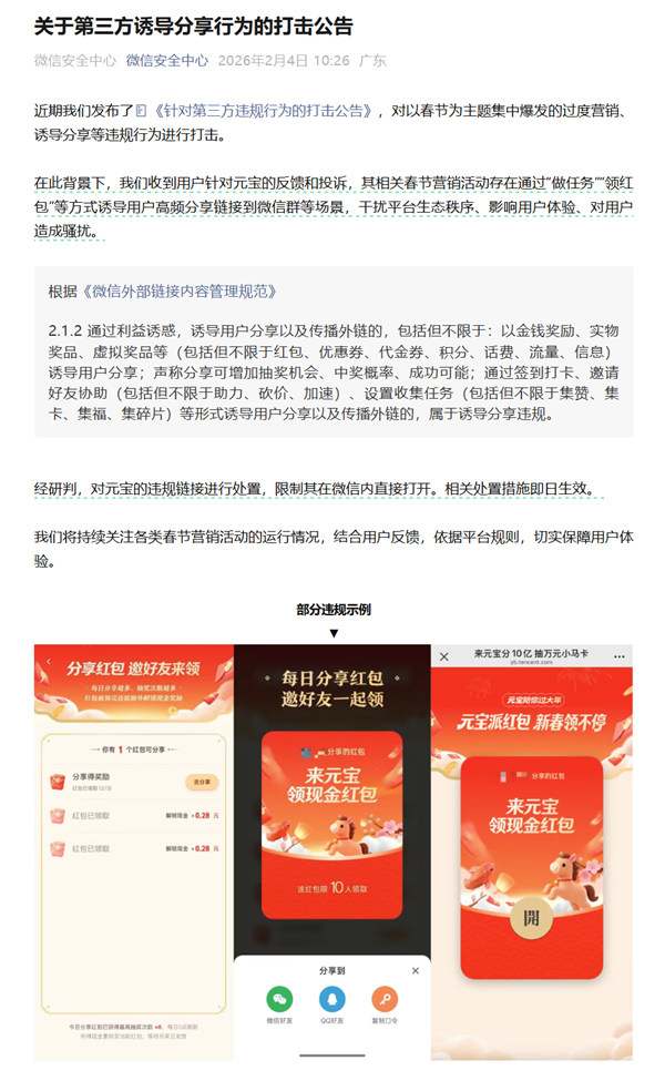 《公告》指出微信收到了用户针对元宝的反馈和投诉,其相关春节营销活动存在通过做任务领红包等方式诱导用户高频分享链接到微信群等场景,干扰平台生态秩序,影响用户体验,对用户造成骚扰。