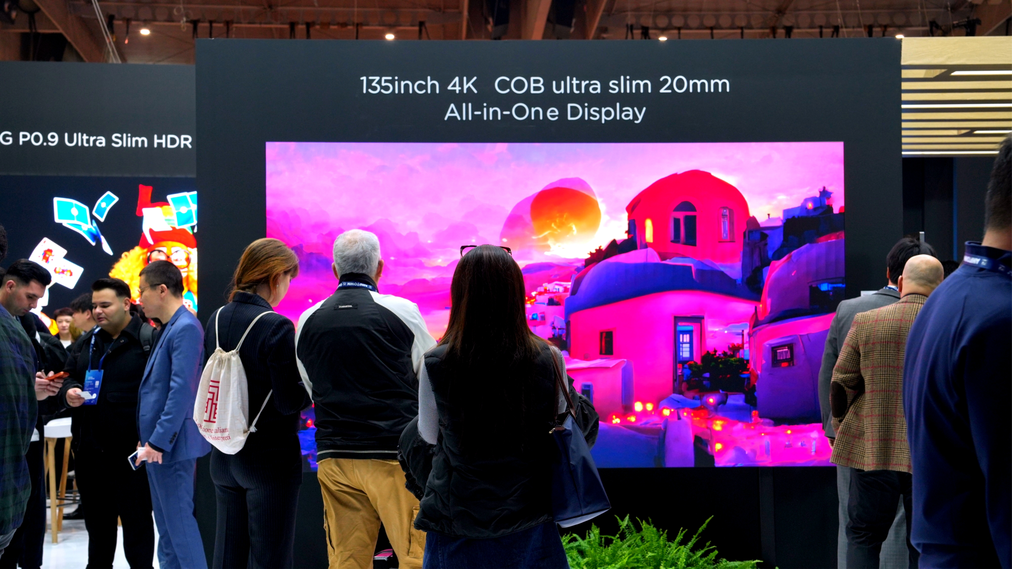 展区现场,BOE(京东方)带来由α-MLED高端技术品牌赋能的多款MLED创新显示解决方案,以硬核科技实力为海外观众重新定义MLED好屏标准。其中,COG P0.9 超薄 HDR MicroLED显示屏以革命性技术成为焦点,不仅具备3000尼特超高亮度HDR,并通过AM护眼科技有效降低蓝光和闪烁,纤薄机身使每平米减重25%,162英寸巨幕所需拼接模组由288块减至48块,安装效率提升5倍,适用于家庭巨幕、艺术展示等多场景;BYH Ultra P0.9作为高端COB产品,搭配自研光学技术,在10流明环境光下实现20000:1对比度和1500nit全局亮度,保持冷屏温度,大模组设计进一步提升安装效率;135英寸4K COB超薄20毫米一体机屏占比高达99.4%,厚度仅20毫米,冷屏模式下屏幕温度低至37℃,支持2K/4K分辨率以及135/162可选尺寸,满足不同场景使用需求;全球首款GPR 3D 162英寸P1.25 COB直显屏支持2D/3D显示一键切换,通过BOE(京东方)COB直显精密像素和独家光配向技术,实现中心串扰低于1%、水平与垂直视角均超过170°的显示效果,适用于商业展示、医疗成像、教育娱乐等场景。