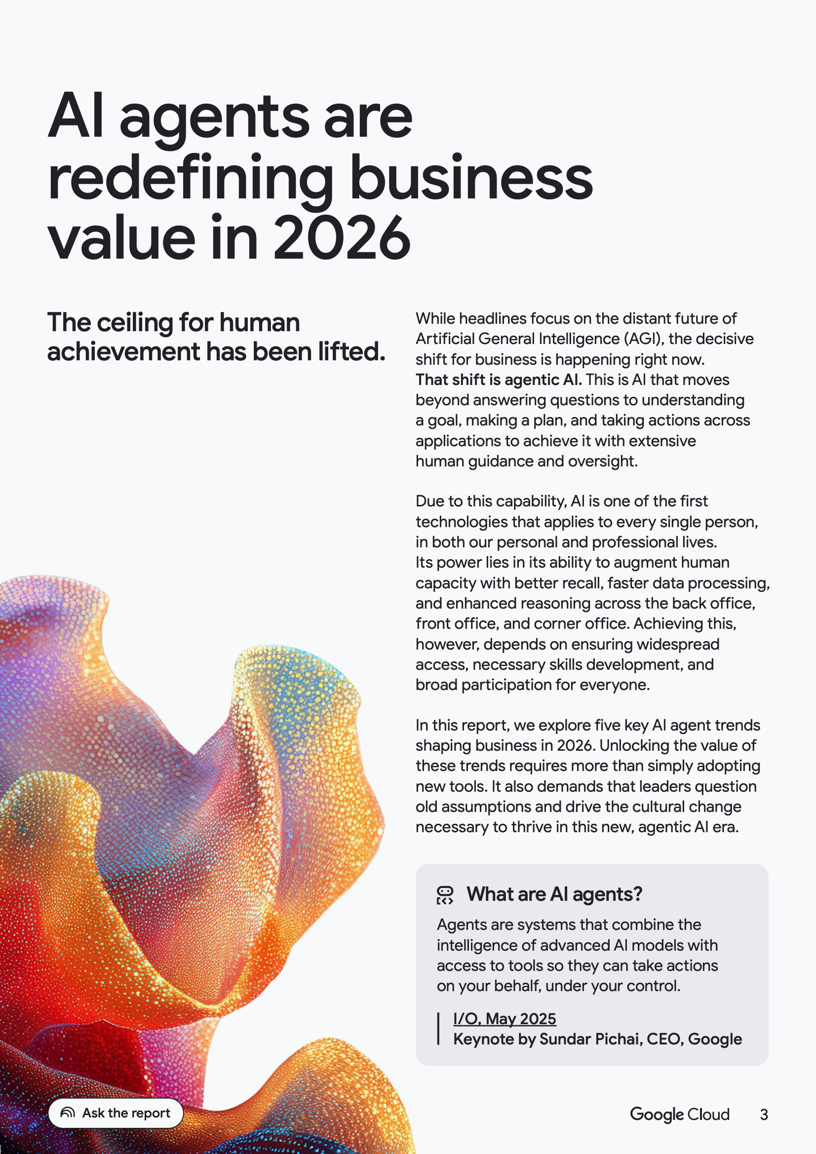 本报告围绕2026年企业级AI代理的发展路径,系统揭示了代理型AI从工具走向生产体系核心的关键拐点。基于对全球3466名企业决策者的调研以及大量企业实践,数据清晰显示,AI代理已从实验阶段进入规模化落地阶段,并开始实质性重塑组织效率与价值创造方式。