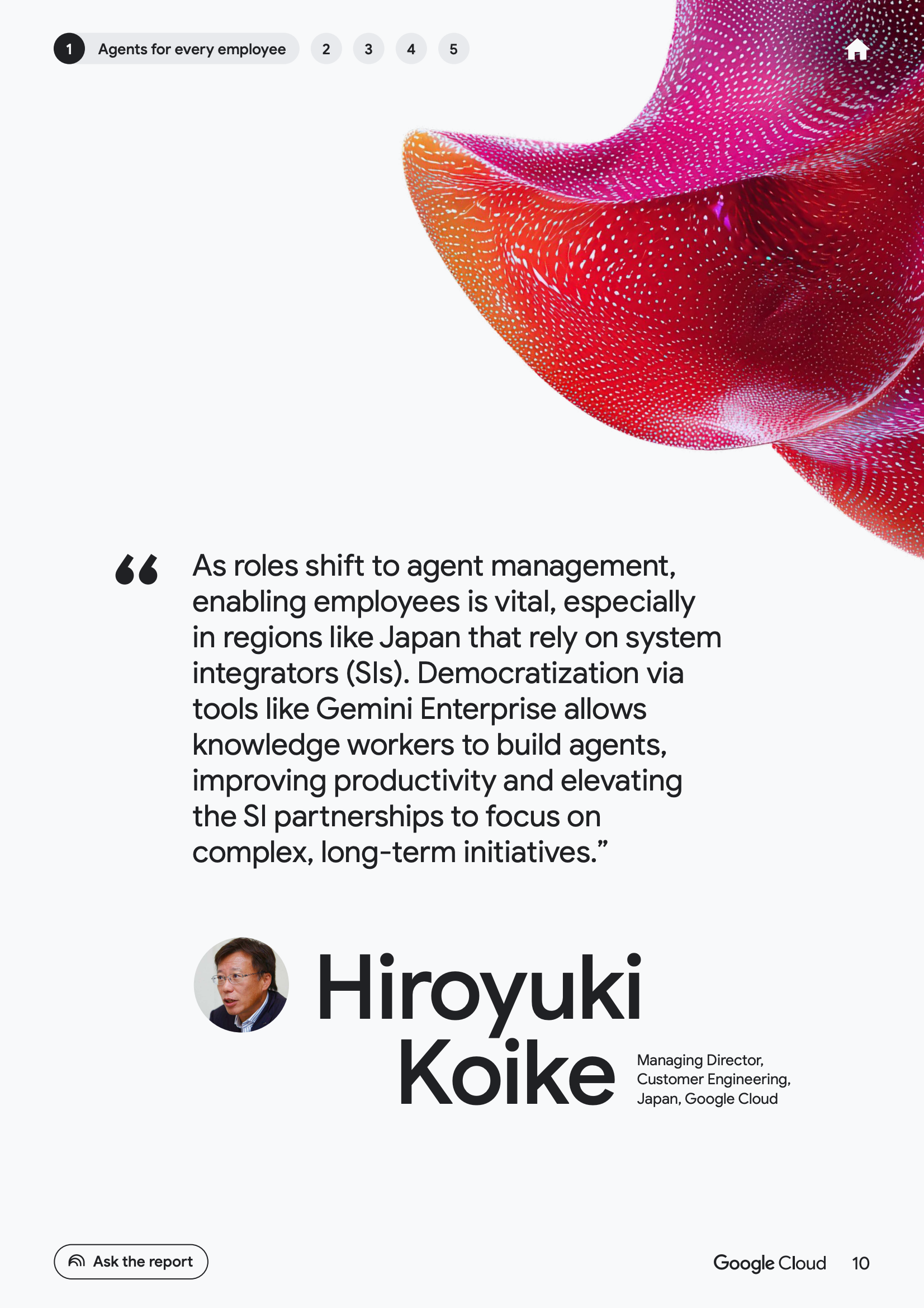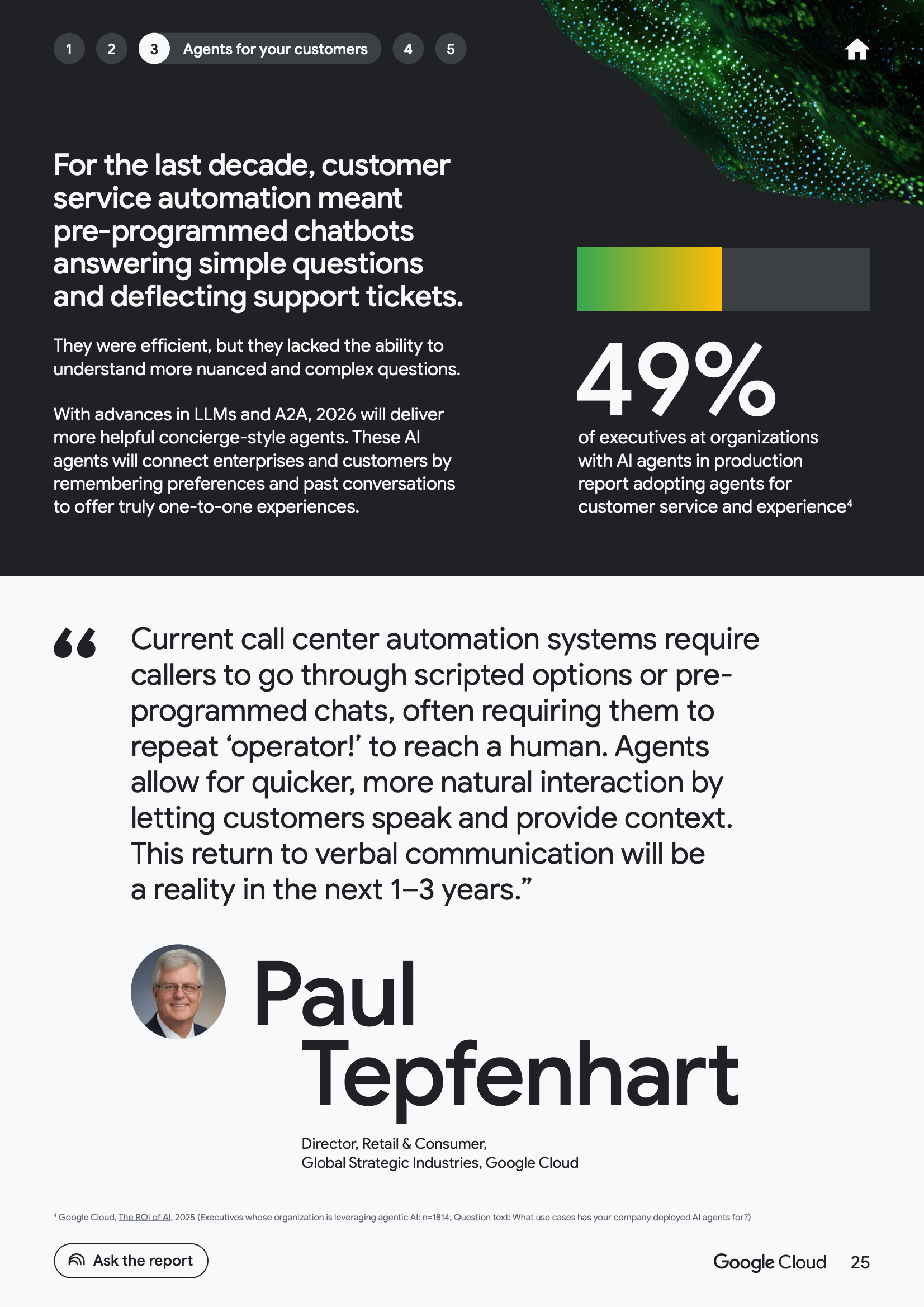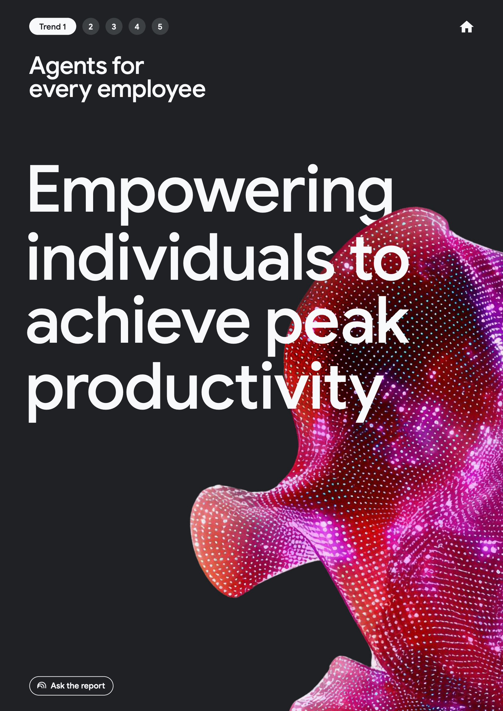 从员工维度看,AI代理正在推动以个人为中心的生产力跃迁。数据显示,52%的已使用生成式AI的企业高管表示,其组织中已有AI代理投入生产环境。其中,49%的企业将代理用于客户服务,46%用于市场或安全运营,45%用于技术支持,43%用于产品创新与研究。这意味着员工角色正从“任务执行者”转向“代理管理者”,工作方式由指令式操作转向目标导向式协同。
