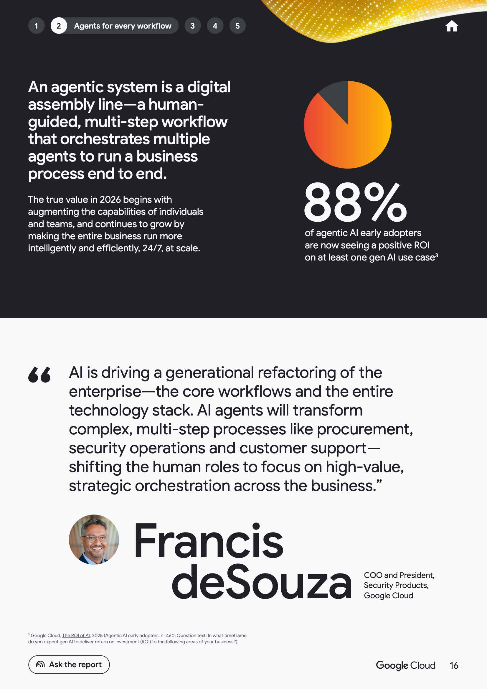 在流程层面,代理型系统开始重构企业核心工作流。88%的代理型AI早期采用者已经在至少一个生成式AI场景中实现正向投资回报。代理被用于端到端流程编排,如采购、安全运营与客户支持,使业务能够以24小时连续运行的方式实现规模化优化,显著降低跨系统协作成本。