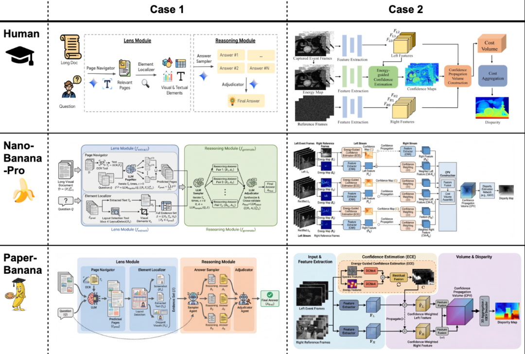 PaperBanana 真正做到了「画清楚、讲明白」,也更符合顶会审美的论文级插图:配色更现代统一,信息更精炼,模块分区更清晰。