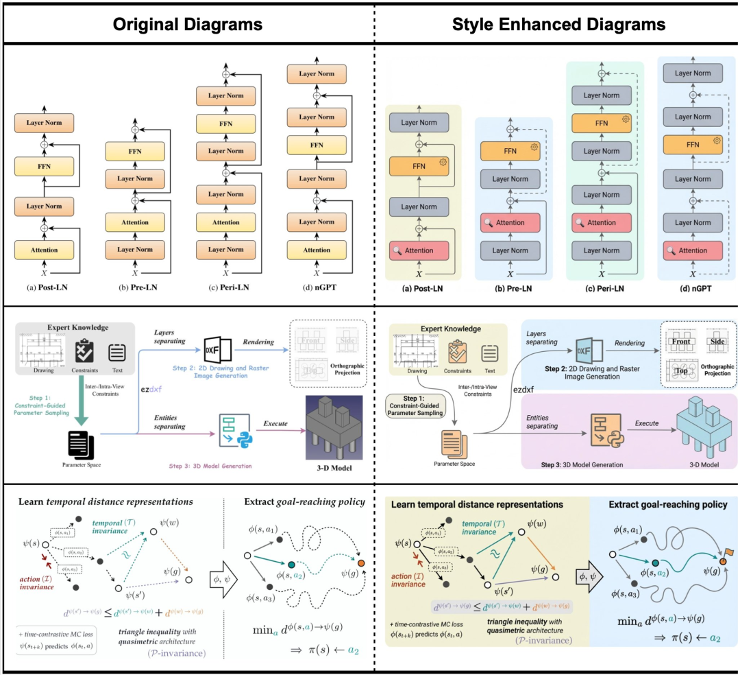 这些示例覆盖了多个典型科研场景,包括 Transformer 与不同 LayerNorm 变体的对比示意、工程流程与三维建模管线的系统框架,以及强化学习和表示学习中抽象几何关系的表达。它们的共同特点在于逻辑复杂、元素密集,对人工排版提出了极高要求,也正是科研人员最容易在“画图”上消耗大量时间与精力的部分。