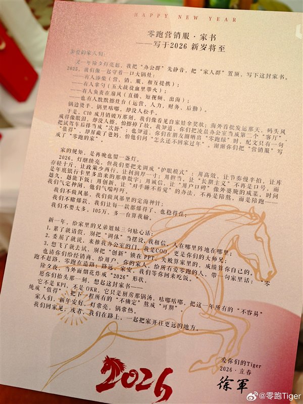 快科技2月5日消息,今日中午,零跑汽车COO徐军在微博晒出“写给零跑营销服的家书”。