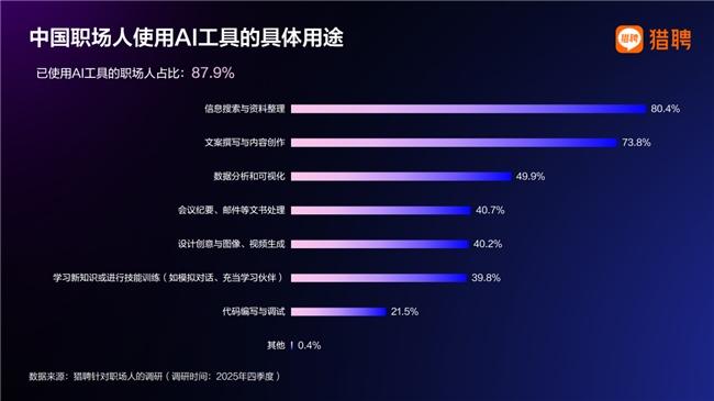 猎聘调研显示,随着AI应用不断深化,职场人对人工智能的态度已由早期的“技术焦虑”转向主动拥抱,2025年已有87.9%的职场人表示正在使用AI,并普遍将其视为提升个人竞争力和工作效率的“生产力倍增器”。在实际应用中,AI不仅在信息搜索、资料整理和内容创作等高频场景中显著降低了重复性劳动成本,还加速渗透至数据分析、可视化及基础代码编写等原本由技术岗位主导的领域,使非技术背景人员也能通过自然语言指令完成复杂任务,模糊了岗位能力边界,推动职场能力实现系统性补齐与重构。